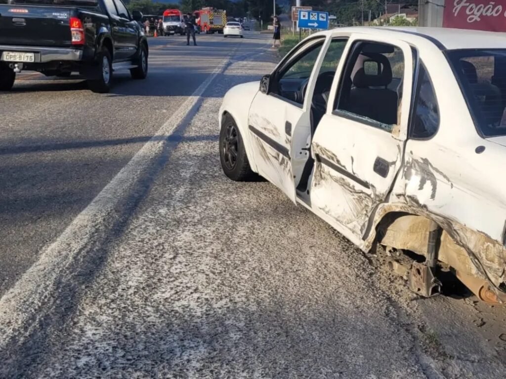 Um grave acidente envolvendo três veículos — um Chevrolet Corsa Classic branco, uma Mitsubishi L200 Triton grafite e um Volkswagen Gol vermelho — resultou na morte de uma pessoa na tarde deste sábado (19), no km 114 da BR-262, em Venda Nova do Imigrante. De acordo com testemunhas, um dos carros teria invadido a contramão, provocando o choque em cadeia. A vítima fatal ficou presa às ferragens e foi retirada sem vida pelos Bombeiros do 2º Pelotão, com apoio do SAMU, Polícia Militar, PRF e Polícia Civil.
