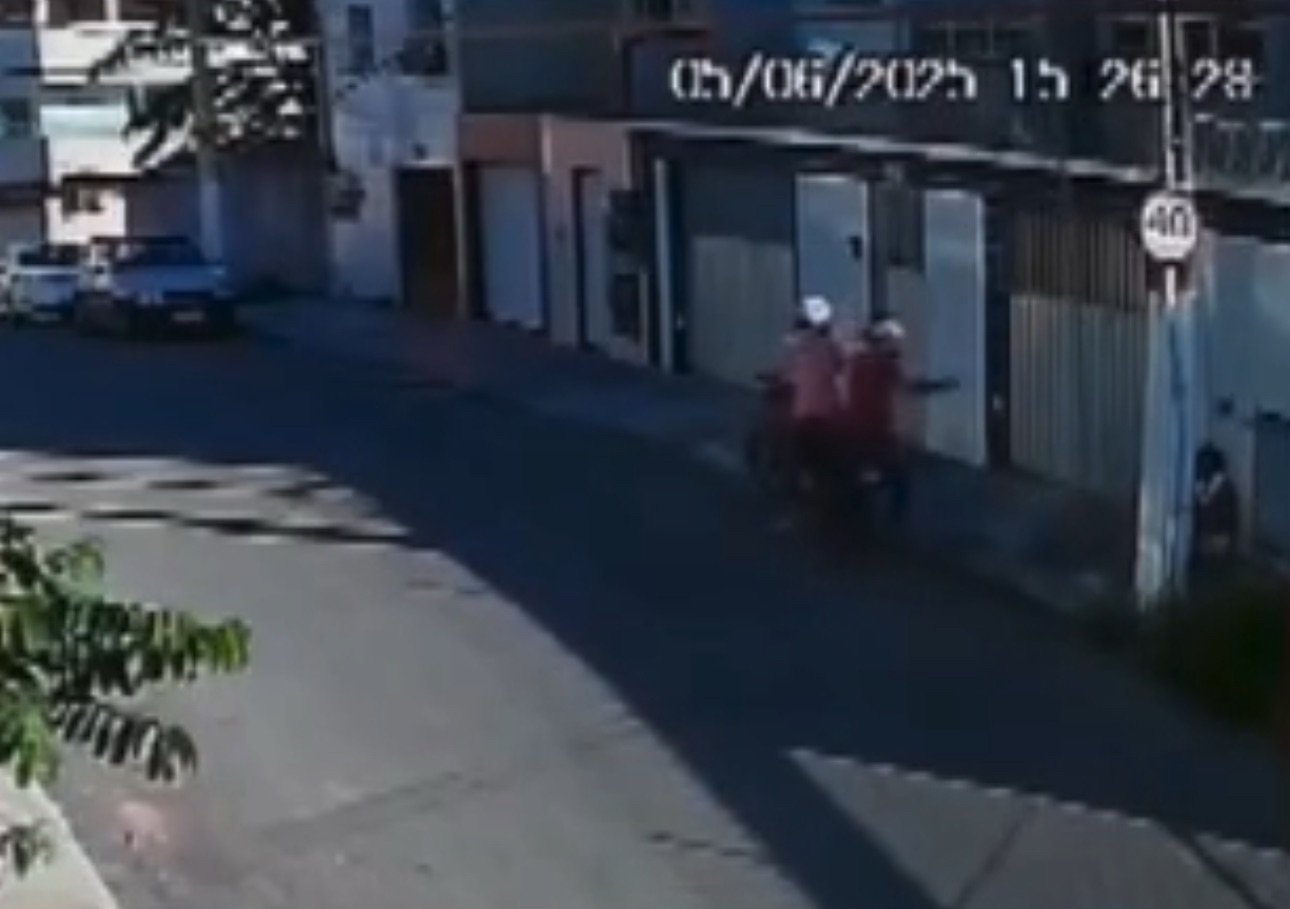 Uma adolescente foi vítima de assalto na tarde de quinta-feira (5) enquanto estava sentada na calçada no bairro Cocal, em Vila Velha. Câmeras de segurança registraram o momento em que dois homens em uma moto se aproximam; um deles desce, aponta uma arma para a jovem e rouba seu celular. Após o crime, os suspeitos fugiram do local.