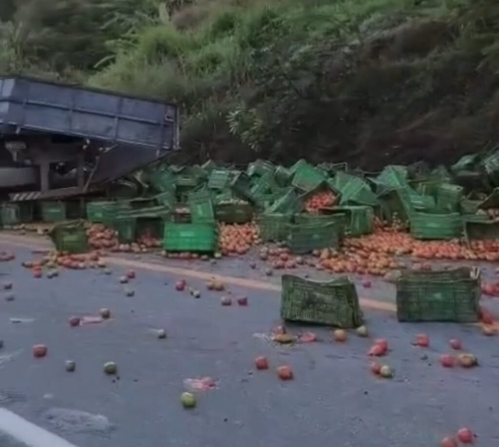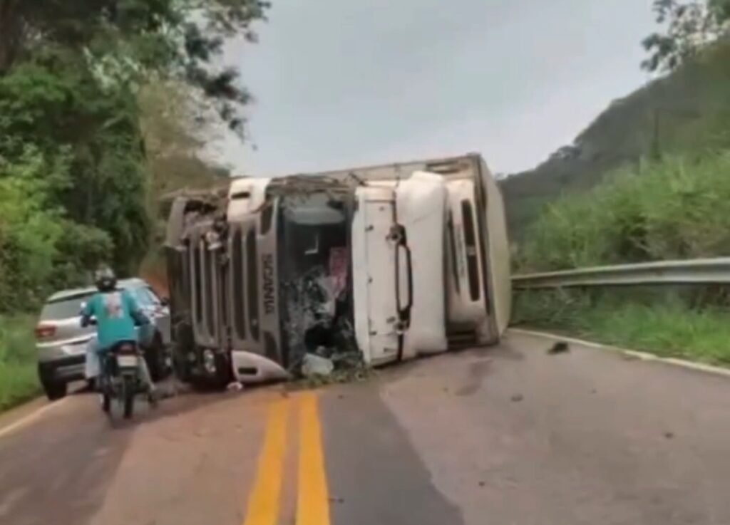 Vídeo: Caminhão carregado de tomates tomba na BR-262 em Iúna