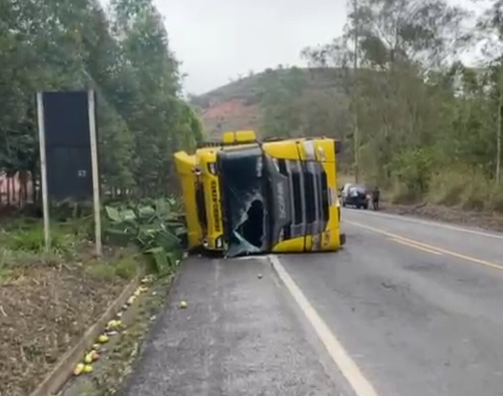 Carreta carregada de tomates tomba na BR-262 próximo a Brejetuba