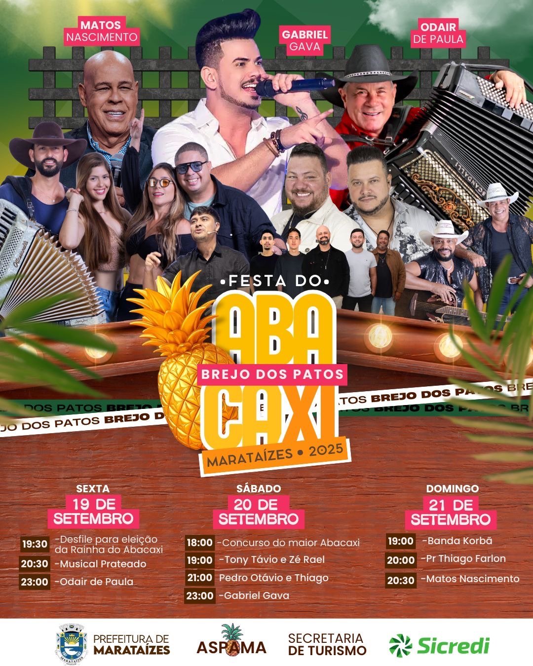No sábado (20), a festa segue com o concurso do maior abacaxi e shows de Tony Távio & Zé Rael, Pedro Otávio & Thiago e show nacional com Gabriel Gava. Já no domingo (21), o público confere a Banda Korbá, a participação do pastor Thiago Farlon e encerra a programação com Matos Nascimento.