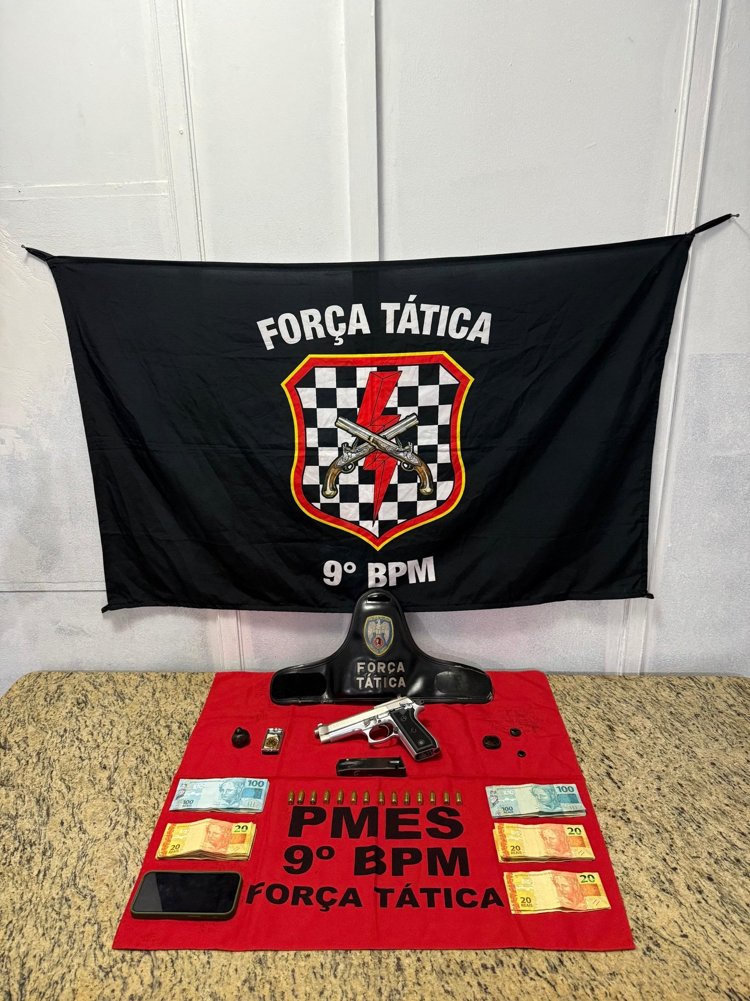 Durante a operação, os militares abordaram o suspeito e encontraram uma pistola Taurus 9 mm, 14 munições, um iPhone, uma balança de precisão, R$ 1.698 em dinheiro, 34,64 gramas de entorpecente conhecido como “pac” e a motocicleta usada no crime. Guilherme foi detido e encaminhado à Delegacia Regional de Cachoeiro para as providências legais.