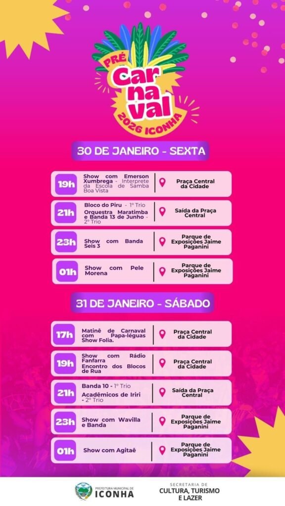 O coração do folião capixaba já tem destino certo para bater mais forte. A Prefeitura de Iconha, por meio da Secretaria de Cultura, Turismo e Lazer, confirmou a programação do Pré-Carnaval 2026.