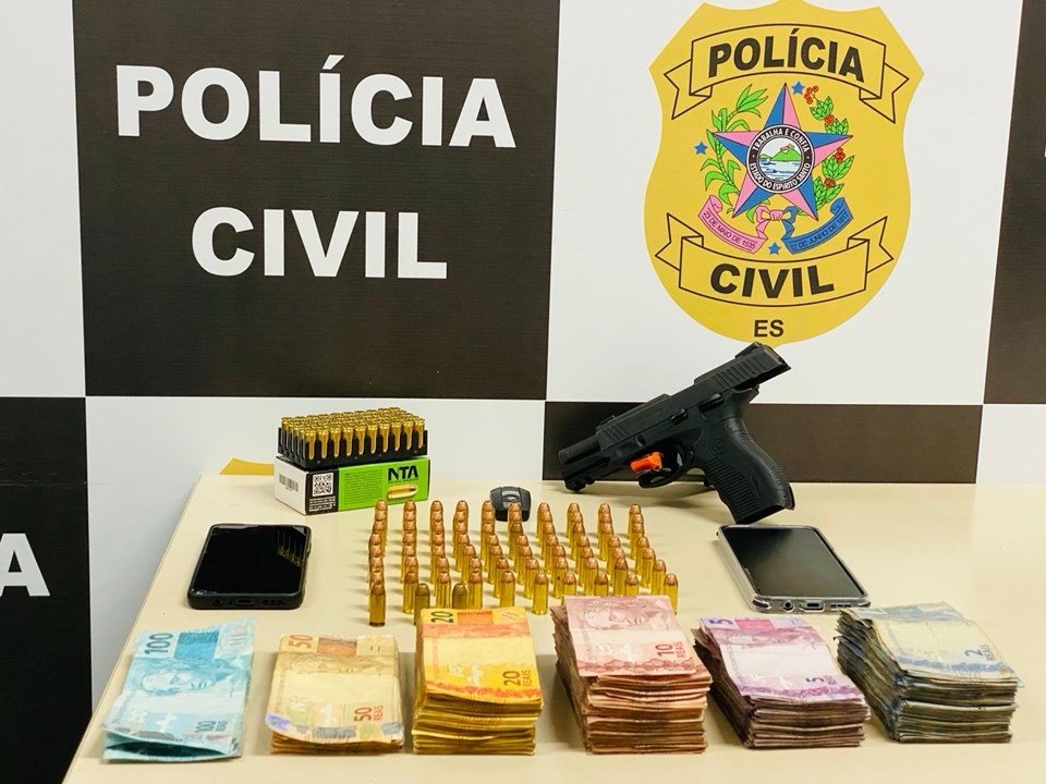 Na residência dele, os policiais localizaram uma pistola calibre .40 da marca Taurus, com um carregador municiado com 15 munições. Também foi apreendida uma caixa com 50 munições do mesmo calibre e, no interior de um veículo BMW, mais 58 munições escondidas dentro de uma meia, totalizando 123 munições. Além disso, os policiais apreenderam R$ 6.480,00 em espécie, encontrados dentro de uma sacola no interior da residência.
