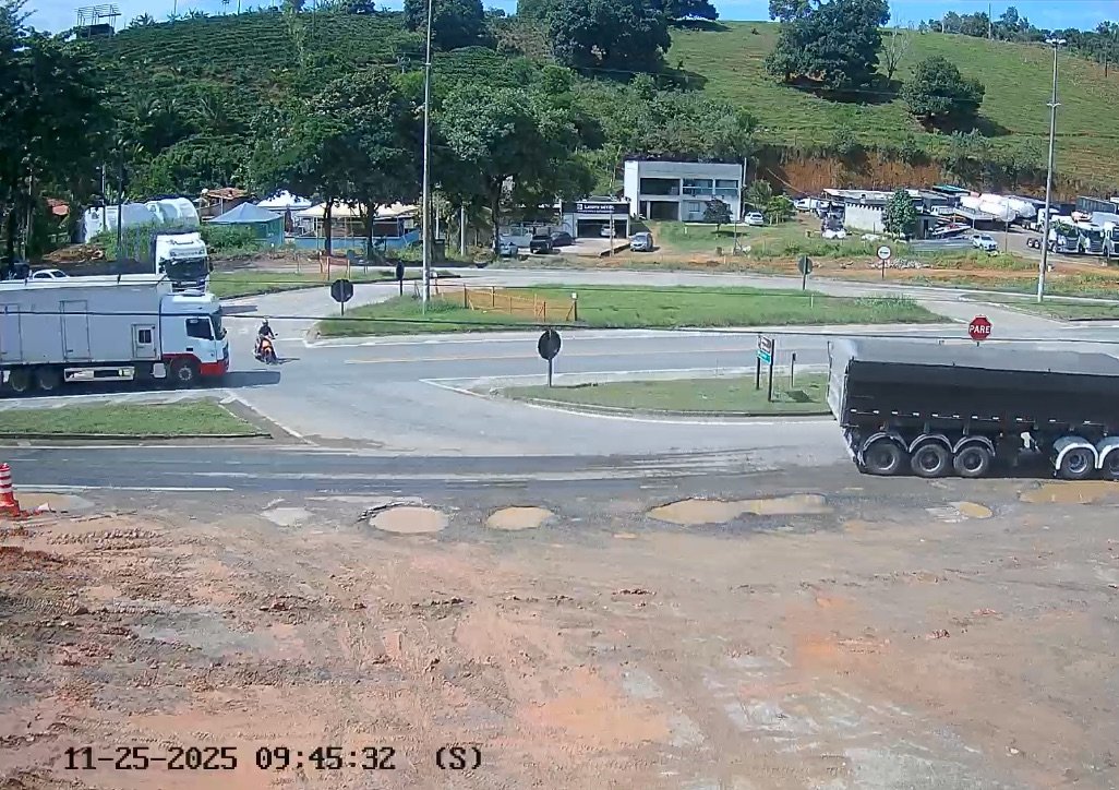 Um acidente entre um caminhão de pequeno porte e uma motocicleta quase terminou em tragédia no trevo de acesso a Piúma, na BR-101. Uma câmera de segurança registrou o momento em que o motociclista tenta cruzar a rodovia e acaba colidindo na lateral do caminhão.